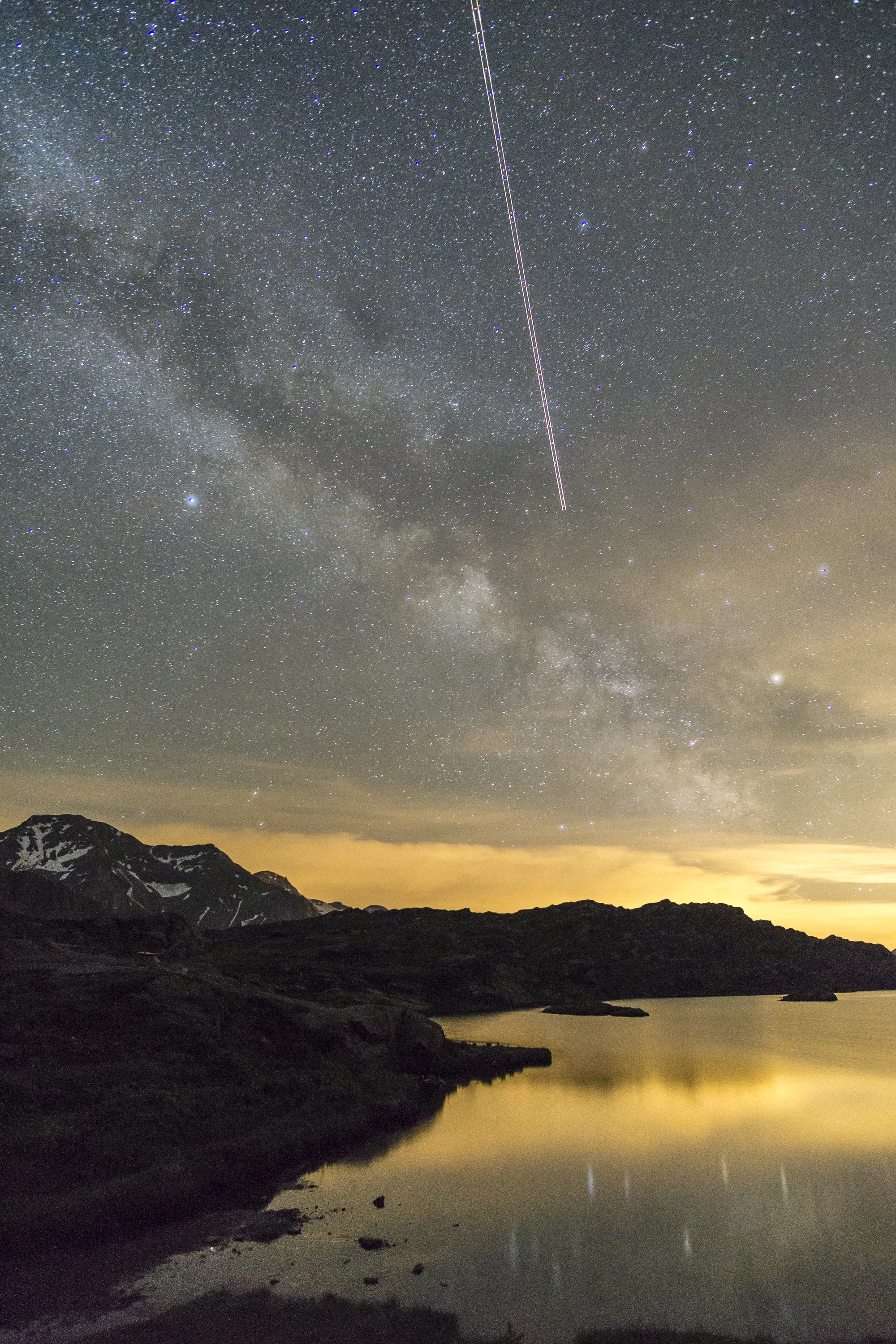 Ieri notte ho effettuato la prima prova di fotografia della Via Lattea. Dopo un breve temporale il cielo si è aperto completamente e mi ha permesso di scattare alcune foto, tra cui ho scelto questa che mostra anche il volo di un aereo verso sud, oltre ad alcune altre con differenti situazioni.